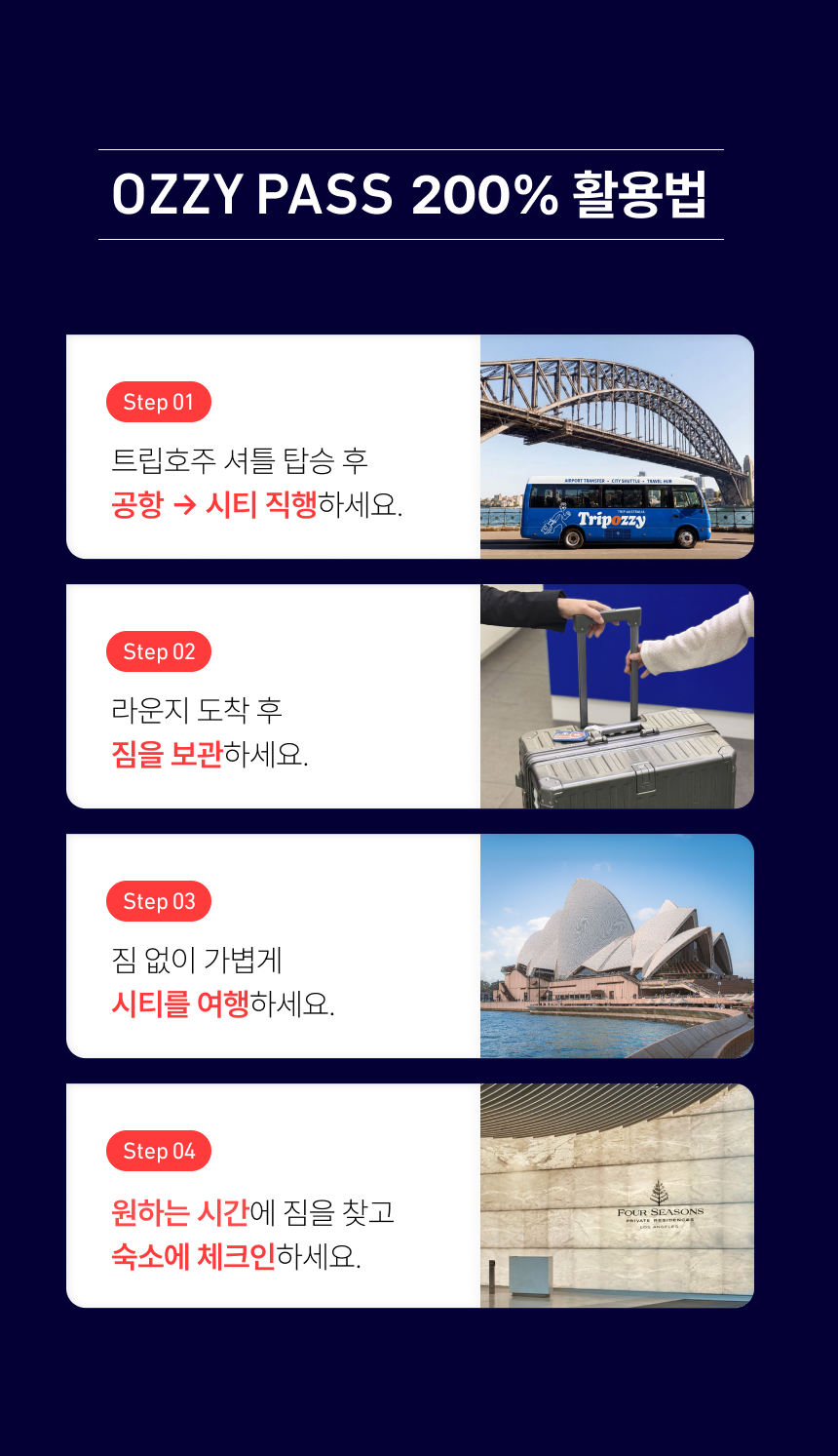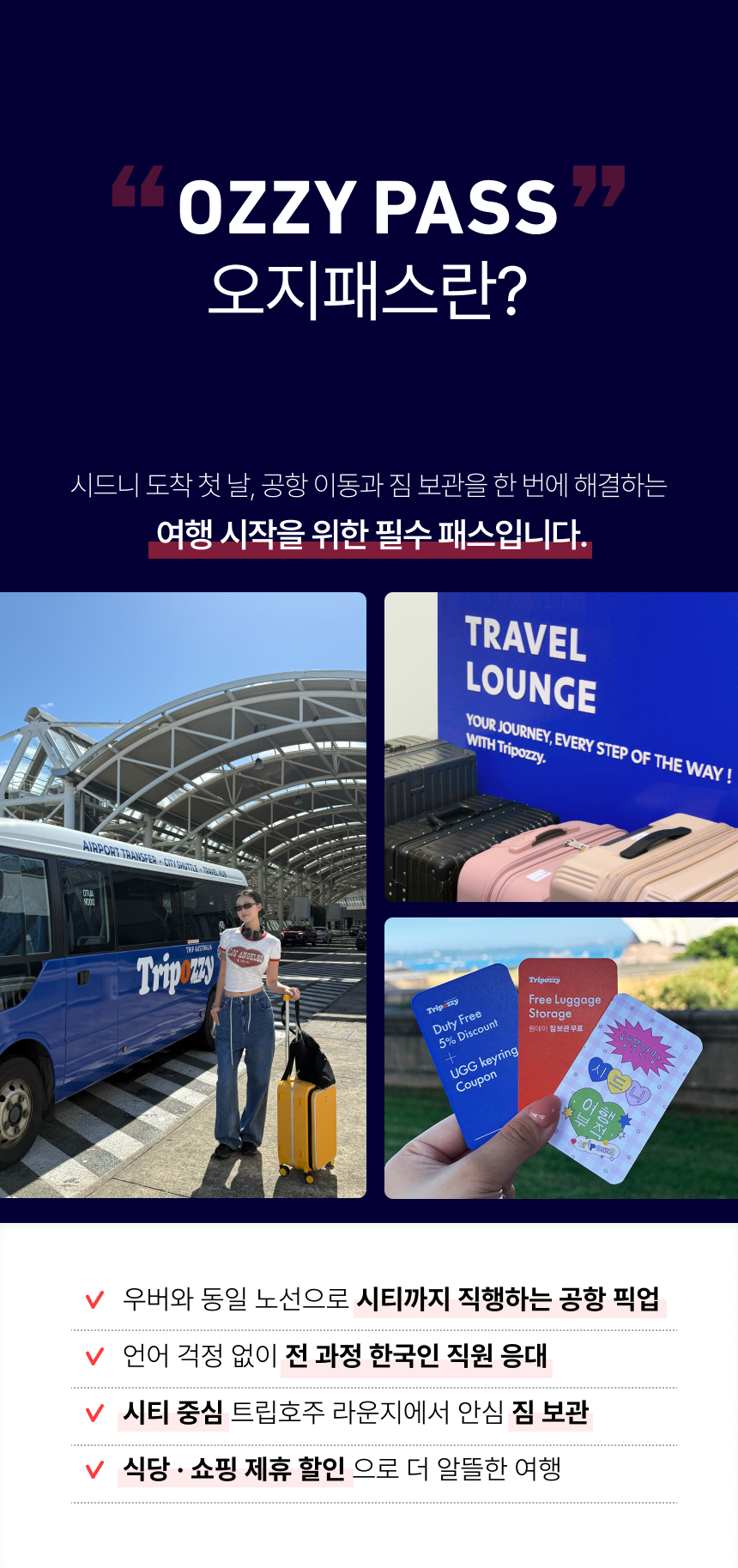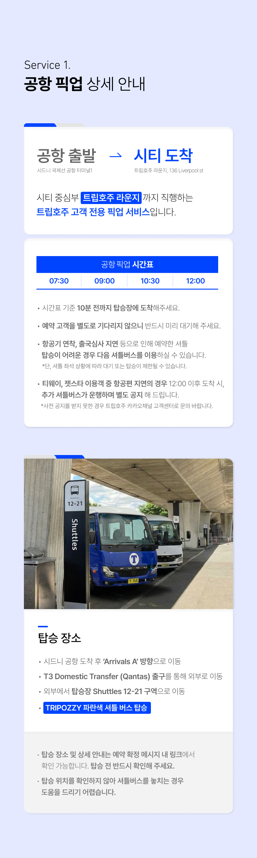 공항 픽업은 트립호주 라운지 단일 하차입니다. 라운지는 시드니 주요 호텔과 관광지가 밀집한 시티 중심가에 위치해 있어, 하차 후 도보로 가깝게 이동하실 수 있습니다.
