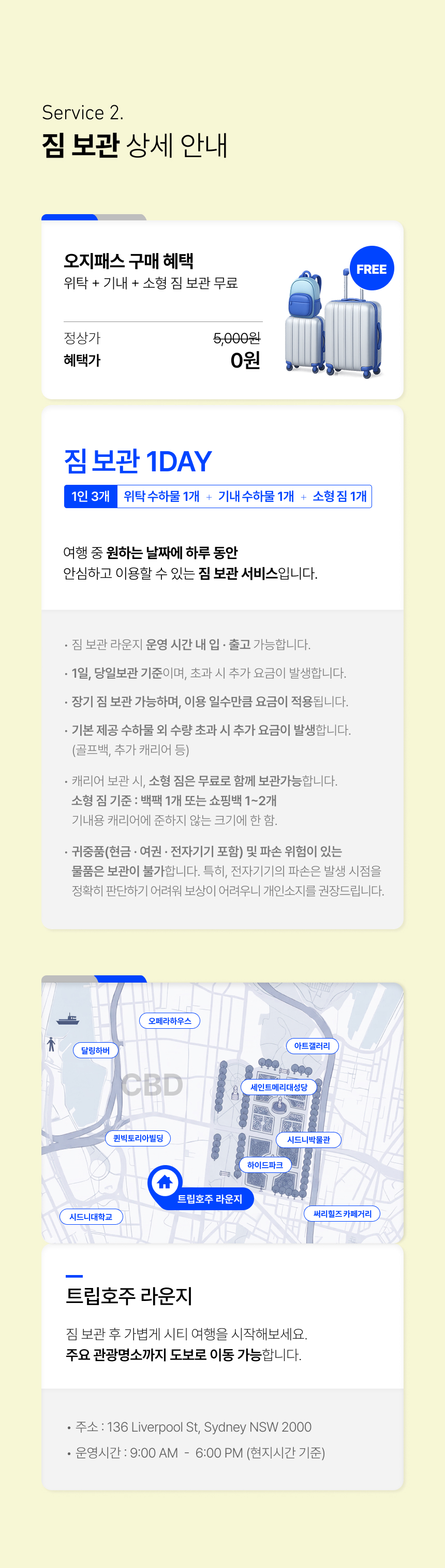 시드니 면세점(시티) 내 위치한 트립호주 라운지에서 짐보관 서비스를 이용하실 수 있습니다. 라운지에서 수령한 짐보관 쿠폰을 제시하시면 됩니다.